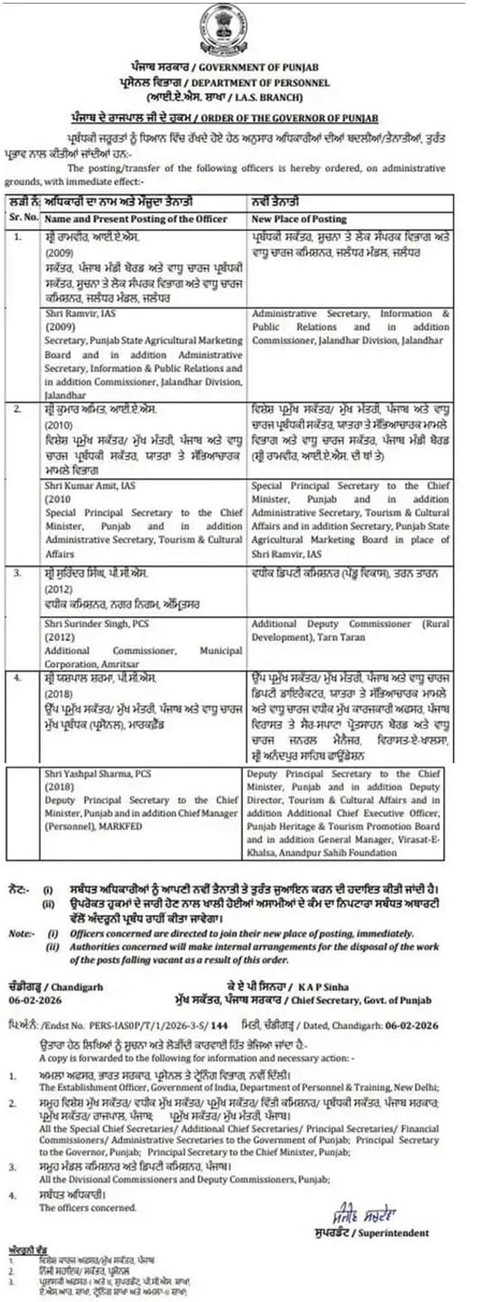 Punjab News: ਪੰਜਾਬ ਸਰਕਾਰ ਨੇ ਸ਼ੁੱਕਰਵਾਰ ਸ਼ਾਮ ਨੂੰ ਸਿਵਲ ਪ੍ਰਸ਼ਾਸਨ ਵਿਚ ਤਬਾਦਲੇ ਕੀਤੇ ਹਨ। ਬਦਲੇ ਗਏ ਅਧਿਕਾਰੀਆਂ ਦੀ ਲਿਸਟ ਹੇਠਾਂ ਨੱਥੀ ਹੈ।