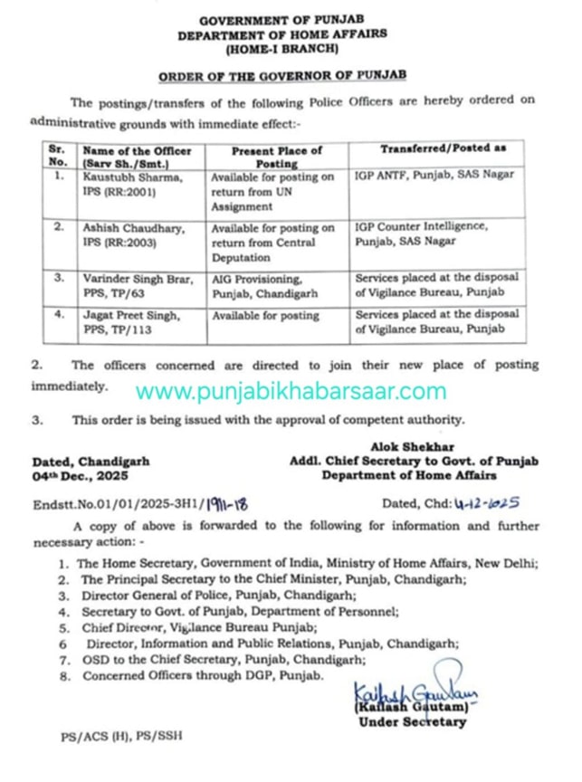 Chandigarh News:ਪੰਜਾਬ ਸਰਕਾਰ ਨੇ ਵੀਰਵਾਰ ਨੂੰ ਚਾਰ ਸੀਨੀਅਰ ਪੁਲਿਸ ਅਧਿਕਾਰੀਆਂ ਦੇ ਤਬਾਦਲੇ ਕੀਤੇ ਹਨ। ਬਦਲੇ ਗਏ ਅਧਿਕਾਰੀਆਂ ਵਿਚ 2 IPS ਅਤੇ 2 PPS ਅਧਿਕਾਰੀ ਸ਼ਾਮਲ ਹਨ। ਇੰਨ੍ਹਾਂ ਵਿਚ ਯੂਐਨ ਮਿਸ਼ਨ ਤੋਂ ਵਾਪਸ ਆਏ 2001 ਬੈਚ ਦੇ ਸੀਨੀਅਰ ਆਈਪੀਐਸ ਅਧਿਕਾਰੀ ਕੋਸਤਬ ਸ਼ਰਮਾ ਨੂੰ ਆਈਜੀ IG ANTF ਅਤੇ ਕੇਂਦਰੀ ਡੈਪੁਟੇਸ਼ਨ ਤੋਂ ਵਾਪਸ ਆਏ 2003 ਬੈਚ ਦੇ ਆਈਪੀਐਸ ਅਧਿਕਾਰੀ ਅਸ਼ੀਸ ਚੌਧਰੀ ਨੂੰ IG Counter Intelligence ਲਗਾਇਆ ਗਿਆ। ਇਸੇ ਤਰ੍ਹਾਂ ਪੀਪੀਐਸ ਅਧਿਕਾਰੀ ਵਰਿੰਦਰ ਸਿੰਘ ਬਰਾੜ ਅਤੇ ਜਗਤਪ੍ਰੀਤ ਸਿੰਘ ਦੀਆਂ ਸੇਵਾਵਾਂ ਵਿਜੀਲੈਂਸ ਨੂੰ ਸੌਪੀਆਂ ਗਈਆਂ ਹਨ ਤੇ ਸੰਭਾਵਿਤ ਤੌਰ ‘ਤੇ ਵਿਜੀਲੈਂਸ ਵੱਲੋਂ ਇੰਨ੍ਹਾਂ ਦੀ ਨਵੀਂ ਨਿਯੁਕਤੀ ਦਾ ਐਲਾਨ ਇੱਕ-ਦੋ ਦਿਨਾਂ ਵਿਚ ਕੀਤਾ ਜਾਵੇਗਾ।