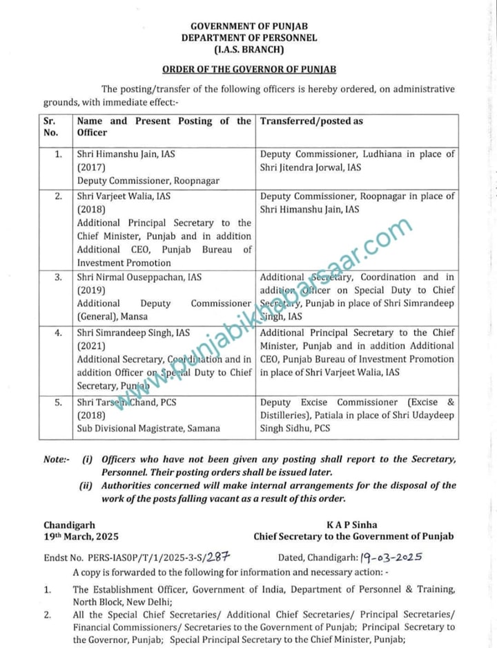 Chandigarh News: ਪੰਜਾਬ ਸਰਕਾਰ ਵੱਲੋਂ ਅੱਜ ਬੁਧਵਾਰ ਨੂੰ ਸਿਵਲ ਪ੍ਰਸ਼ਾਸਨ ਵਿਚ ਕੀਤੇ ਵੱਡੇ ਤਬਾਦਲਿਆਂ ਦੇ ਵਿੱਚ 2 ਡਿਪਟੀ ਕਮਿਸ਼ਨਰਾਂ ਸਹਿਤ 5 ਅਧਿਕਾਰੀਆਂ ਨੂੰ ਬਦਲ ਦਿੱਤੇ ਹਨ। ਬਦਲੇ ਗਏ ਅਧਿਕਾਰੀਆਂ ਦੀ ਲਿਸਟ ਹੇਠਾਂ ਨੱਥੀ ਹੈ