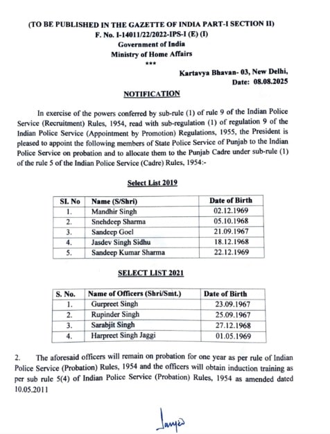 Punjab News: ਕੇਂਦਰੀ ਗ੍ਰਹਿ ਵਿਭਾਗ ਨੇ ਅੱਜ ਇੱਕ ਆਦੇਸ਼ ਜਾਰੀ ਕਰਦਿਆਂ ਪੰਜਾਬ ਪੁਲਿਸ ਦੇ 9 PPS ਅਫ਼ਸਰਾਂ ਨੂੰ IPS ਬਣਾਉਣ ਦਾ ਐਲਾਨ ਕੀਤਾ ਹੈ। ਤਰੱਕੀ ਪਾਉਣ ਵਾਲੇ ਇੰਨ੍ਹਾਂ 9 ਅਫ਼ਸਰਾਂ ਦੀ ਲਿਸਟ ਹੇਠਾਂ ਨੱਥੀ ਹੈ।
