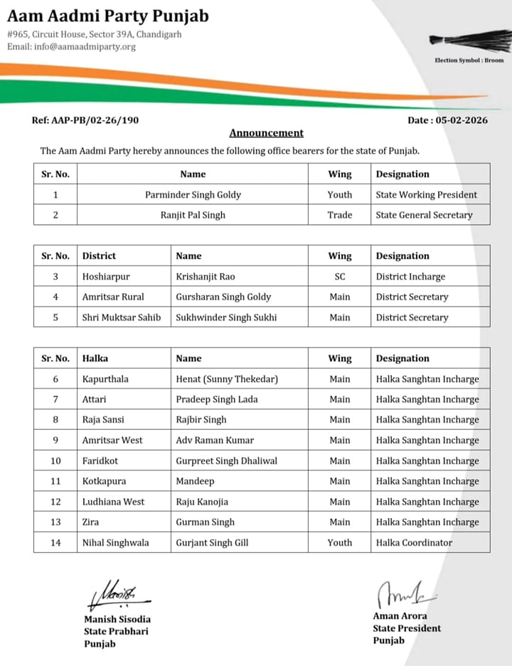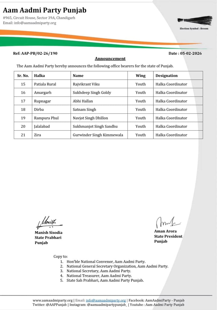 AAP ਵੱਲੋਂ Youth Wing ਦੇ ਨਵੇਂ ਪ੍ਰਧਾਨ ਤੇ ਕਈ ਹਲਕਾ ਇੰਚਾਰਜਾਂ ਦਾ ਐਲਾਨ