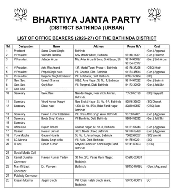 Bathinda News: Bathinda BJP ; ਅੱਜ ਭਾਰਤੀ ਜਨਤਾ ਪਾਰਟੀ ਬਠਿੰਡਾ ਸ਼ਹਿਰੀ ਦੇ ਜ਼ਿਲ੍ਹਾ ਪ੍ਰਧਾਨ ਸਰੂਪ ਚੰਦ ਸਿੰਗਲਾ ਵੱਲੋਂ ਆਪਣੀ ਜ਼ਿਲ੍ਹਾ ਜਥੇਬੰਦੀ ਦਾ ਐਲਾਨ ਕਰ ਦਿੱਤਾ ਗਿਆ ਹੈ। ਪੰਜਾਬ ਦੇ ਕਾਰਜਕਾਰੀ ਪ੍ਰਧਾਨ ਅਸ਼ਵਨੀ ਸ਼ਰਮਾ ਅਤੇ ਪੰਜਾਬ ਪ੍ਰਧਾਨ ਸੁਨੀਲ ਜਾਖੜ ਅਤੇ ਸੰਗਠਨ ਮੰਤਰੀ ਸ੍ਰੀਨਿਵਾਸੂ ਦੇ ਨਾਲ ਸਲਾਹ ਮਸ਼ਵਰਾ ਕਰਨ ਉਪਰੰਤ ਸ਼੍ਰੀ ਸਿੰਗਲਾ ਵੱਲੋਂ ਸੂਬਾ ਜਨਰਲ ਸਕੱਤਰ ਅਤੇ ਮਾਲਵਾ ਜੋਨ ਦੇ ਇੰਚਾਰਜ ਦਿਆਲ ਸੋਢੀ ਦੀ ਮੌਜੂਦਗੀ ਵਿੱਚ ਇਸ ਟੀਮ ਦਾ ਐਲਾਨ ਕੀਤਾ ਗਿਆ। ਇਸ ਮੌਕੇ ਉਨ੍ਹਾਂ ਕਿਹਾ ਕਿ ਆਉਣ ਵਾਲੇ ਦਿਨਾਂ ਵਿਚ ਟੀਮ ਦਾ ਹੋਰ ਵਿਸਤਾਰ ਕੀਤਾ ਜਾਵੇਗਾ ਅਤੇ ਸੈੱਲਾਂ ਅਤੇ ਮੋਰਚਿਆਂ ਦੀ ਘੋਸ਼ਣਾ ਵੀ ਜਲਦੀ ਹੀ ਕੀਤੀ ਜਾਵੇਗੀ। ਨਵੀਂ ਐਲਾਨੀ ਟੀਮ ਵਿਚ 5 ਉਪ ਪ੍ਰਧਾਨ, 3 ਜਨਰਲ ਸੈਕਟਰੀ, 5 ਸੈਕਟਰੀ, 1 ਦਫ਼ਤਰ ਸਕੱਤਰ ਅਤੇ ਕੈਸ਼ੀਅਰ ਤੋਂ ਇਲਾਵਾ ਵੱਖ ਵੱਖ ਮੋਰਚਿਆਂ ਦੇ ਕਨਵੀਨਰ ਸ਼ਾਮਲ ਕੀਤੇ ਗਏ ਹਨ।