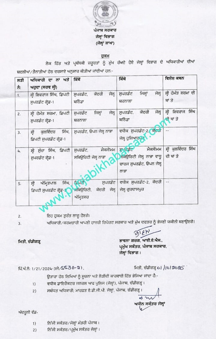 Bathinda News: ਪੰਜਾਬ ਸਰਕਾਰ ਨੇ ਪੰਜ ਜੇਲ੍ਹਾਂ ਦੇ ਸੁਪਰਡੈਂਟਾਂ ਦੇ ਤਬਾਦਲੇ ਕਰ ਦਿੱਤੇ ਹਨ। ਬਦਲੇ ਗਏ ਜੇਲ ਸੁਪਰਡੈਂਟਾਂ ਵਿੱਚ ਬਠਿੰਡਾ ਜੇਲ੍ਹ ਦੇ ਸੁਪਰਡੈਂਟ ਵੀ ਸ਼ਾਮਲ ਹਨ, ਜਿੰਨਾਂ ਦੀ ਜੇਲ੍ਹ ਵਿਚੋਂ ਲੰਘੇ ਸ਼ਨੀਵਾਰ ਨੂੰ ਇੱਕ ਹਵਾਲਾਤੀ ਤਿਲਕ ਰਾਜ ਰਹੱਸਮਈ ਹਲਾਤਾਂ ਵਿੱਚ ਗਾਇਬ ਹੋ ਗਿਆ ਸੀ। ਇਸ ਸਬੰਧ ਵਿੱਚ ਜੇਲ੍ਹ ਵਿਭਾਗ ਵੱਲੋਂ ਇੱਕ ਕਮੇਟੀ ਵੀ ਬਣਾਈ ਸੀ, ਜਿਸਦੀ ਜਾਂਚ ਰਿਪੋਰਟ ਤੋਂ ਬਾਅਦ ਇਹ ਬਦਲੀ ਹੋਈ ਹੈ।