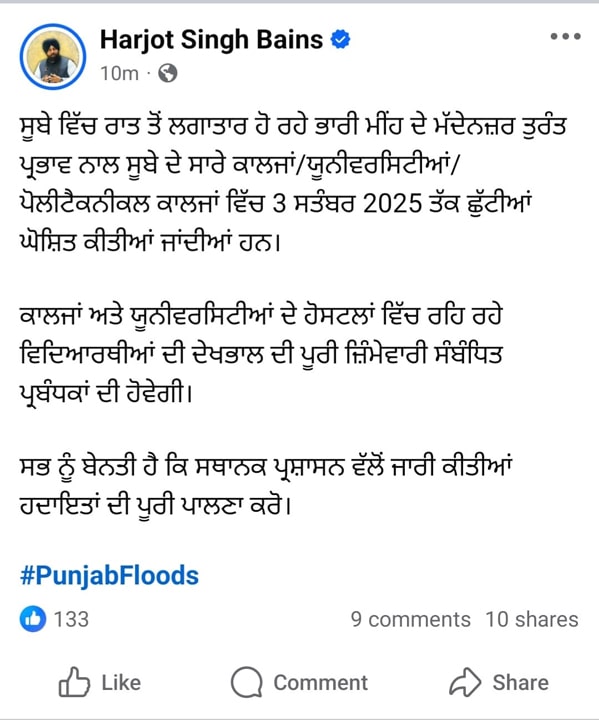 ਇਸਦੀ ਜਾਣਕਾਰੀ ਦਿੰਦਿਆਂ ਪੰਜਾਬ ਦੇ ਉੱਚੇਰੀ ਸਿੱਖਿਆ ਵਿਭਾਗ ਦੇ ਮੰਤਰੀ ਹਰਜੋਤ ਸਿੰਘ ਬੈਂਸ ਨੇ ਅਪਣੇ ਸ਼ੋਸਲ ਮੀਡੀ ਆਰਾਹੀ ਦਸਿਆ ਕਿ, ‘‘ਰਾਤ ਤੋਂ ਲਗਾਤਾਰ ਹੋ ਰਹੇ ਭਾਰੀ ਮੀਂਹ ਦੇ ਮੱਦੇਨਜ਼ਰ ਤੁਰੰਤ ਪ੍ਰਭਾਵ ਨਾਲ ਸੂਬੇ ਦੇ ਸਾਰੇ ਕਾਲਜਾਂ/ਯੂਨੀਵਰਸਿਟੀਆਂ/ਪੋਲੀਟੈਕਨੀਕਲ ਕਾਲਜਾਂ ਵਿੱਚ 3 ਸਤੰਬਰ 2025 ਤੱਕ ਛੁੱਟੀਆਂ ਘੋਸ਼ਿਤ ਕੀਤੀਆਂ ਜਾਂਦੀਆਂ ਹਨ।’’