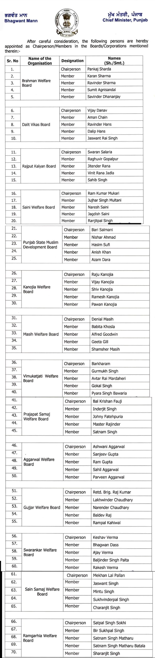 ਵੱਖ ਵੱਖ ਬੋਰਡਾਂ ਦੇ ਲਗਾਏ ਗਏ ਚੇਅਰਮੈਨਾਂ ਤੇ ਮੈਂਬਰਾਂ ਦੀ ਲਿਸਟ ਹੇਠਾਂ ਨੱਥੀ ਹੈ।
