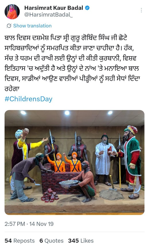 ਇਹ ਵੀ ਪੜ੍ਹੋ ਵੀਰ ਬਾਲ ਦਿਵਸ; ਆਪ ਨੇ ਹਰਸਿਮਰਤ ਕੌਰ ਬਾਦਲ ਦੇ ‘ਟਵੀਟ’ ਲੈ ਕੇ ਅਕਾਲੀ ਦਲ ਨੂੰ ਘੇਰਿਆ