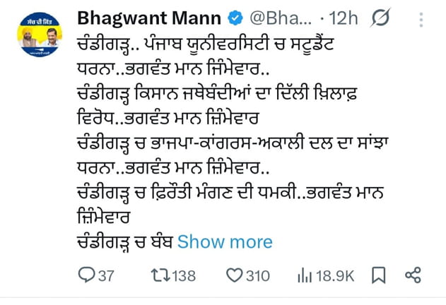 ਚੰਡੀਗੜ੍ਹ.. ਪੰਜਾਬ ਯੂਨੀਵਰਸਿਟੀ ਚ ਸਟੂਡੈਂਟ ਧਰਨਾ..ਭਗਵੰਤ ਮਾਨ ਜਿੰਮੇਵਾਰ..,ਚੰਡੀਗੜ੍ਹ ਕਿਸਾਨ ਜਥੇਬੰਦੀਆਂ ਦਾ ਦਿੱਲੀ ਖ਼ਿਲਾਫ਼ ਵਿਰੋਧ..ਭਗਵੰਤ ਮਾਨ ਜ਼ਿੰਮੇਵਾਰ,ਚੰਡੀਗੜ੍ਹ ਚ ਭਾਜਪਾ-ਕਾਂਗਰਸ-ਅਕਾਲੀ ਦਲ ਦਾ ਸਾਂਝਾ ਧਰਨਾ..ਭਗਵੰਤ ਮਾਨ ਜ਼ਿੰਮੇਵਾਰ.., ਚੰਡੀਗੜ੍ਹ ਚ ਫ਼ਿਰੌਤੀ ਮੰਗਣ ਦੀ ਧਮਕੀ..ਭਗਵੰਤ ਮਾਨ ਜ਼ਿੰਮੇਵਾਰ,