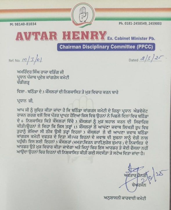 ਇਸਦੀ ਪੁਸ਼ਟੀ ਕਰਦਿਆਂ ਜ਼ਿਲ੍ਹਾ ਕਾਂਗਰਸ ਦੇ ਪ੍ਰਧਾਨ ਰਾਜਨ ਗਰਗ ਨੇ ਦਾਅਵਾ ਕੀਤਾ ਕਿ ‘‘ ਇੰਨ੍ਹਾਂ ਤਿੰਨ ਕੋਂਸਲਰਾਂ ਵੱਲੋਂ ਵੀ ਪਾਰਟੀ ਨੂੰ ਆਪਣਾ ਲਿਖ਼ਤੀ ਸਪੱਸ਼ਟੀਕਰਨ ਭੇਜ ਦਿੱਤ ਾ ਗਿਆ ਸੀ ਪ੍ਰੰਤੂ ਜਵਾਬ ਲੇਟ ਪੁੱਜਣ ਕਾਰਨ ਅਨੁਸਾਸਨੀ ਕਮੇਟੀ ਨੇ ਇੰਨ੍ਹਾਂ ਵਿਰੁਧ ਵੀ ਕਾਰਵਾਈ ਕਰ ਦਿੱਤੀ ਸੀ, ਜਿਸਨੂੰ ਹੁਣ ਇਸ ਪੱਤਰ ਰਾਹੀਂ ਬਦਲਿਆ ਗਿਆ। ’’ ਦਸਣਾ ਬਣਦਾ ਹੈ ਕਿ ਲੰਘੀ 5 ਫ਼ਰਵਰੀ ਨੂੰ ਹੋਈ ਮੇਅਰ ਦੀ ਚੋਣ ਦੌਰਾਨ ਪਾਰਟੀ ਦੇਹੁਕਮਾਂ ਉਲਟ ਕਾਂਗਰਸ ਪਾਰਟੀ ਦੇ 16 ਕੋਂਸਲਰਾਂ ਨੇ ਆਮ ਆਦਮੀ ਪਾਰਟੀ ਦੇ ਉਮੀਦਵਾਰ ਨੂੰ ਵੋਟਾਂ ਪਾ ਦਿੱਤੀਆਂ ਸਨ ਜਦਕਿ ਤਿੰਨ ਵੋਟਿੰਗ ਵਾਲੇ ਦਿਨ ਗੈਰ ਹਾਜ਼ਰ ਰਹੇ ਸਨ। ਇੰਨ੍ਹਾਂ 19 ਕੋਂਸਲਰਾਂ ਦੇ ਇਸ ਫੈਸਲੇ ਕਾਰਨ ਨਗਰ ਨਿਗਮ ਬਠਿੰਡਾ ਵਿਚ ਬਹੁਮਤ ਰੱਖਣ ਦੇ ਬਾਵਜੂਦ ਕਾਂਗਰਸ ਪਾਰਟੀ ਦਾ ਉਮੀਦਵਾਰ ਮੇਅਰ ਦੀ ਚੋਣ ਹਾਰ ਗਿਆ ਸੀ।