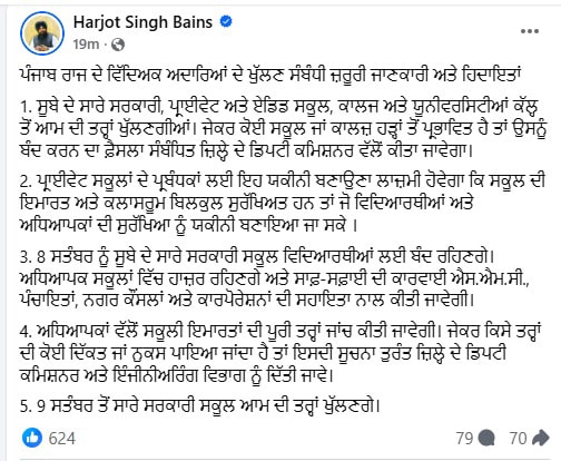 1. ਸੂਬੇ ਦੇ ਸਾਰੇ ਸਰਕਾਰੀ, ਪ੍ਰਾਈਵੇਟ ਅਤੇ ਏਡਿਡ ਸਕੂਲ, ਕਾਲਜ ਅਤੇ ਯੂਨੀਵਰਸਿਟੀਆਂ ਕੱਲ੍ਹ ਤੋਂ ਆਮ ਦੀ ਤਰ੍ਹਾਂ ਖੁੱਲਣਗੀਆਂ। ਜੇਕਰ ਕੋਈ ਸਕੂਲ ਜਾਂ ਕਾਲਜ਼ ਹੜ੍ਹਾਂ ਤੋਂ ਪ੍ਰਭਾਵਿਤ ਹੈ ਤਾਂ ਉਸਨੂੰ ਬੰਦ ਕਰਨ ਦਾ ਫ਼ੈਸਲਾ ਸੰਬੰਧਿਤ ਜ਼ਿਲ੍ਹੇ ਦੇ ਡਿਪਟੀ ਕਮਿਸ਼ਨਰ ਵੱਲੋਂ ਕੀਤਾ ਜਾਵੇਗਾ।