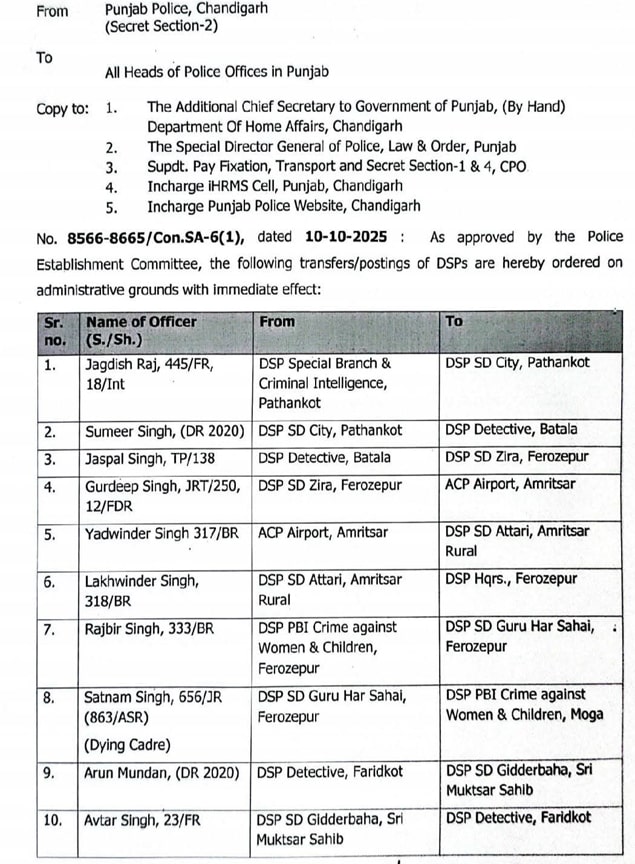 Punjab News: Punjab Police transfers; ਪੰਜਾਬ ਸਰਕਾਰ ਵੱਲੋਂ ਲਗਾਤਾਰ ਅੱਜ ਦੂਜੇ ਦਿਨ ਵੀ ਪੰਜਾਬ ਪੁਲਿਸ ‘ਚ ਵੱਡੀ ਪੱਧਰ ‘ਤੇ ਤਬਾਦਲੇ ਕੀਤੇ ਗਏ ਹਨ।ਇਸਤੋਂ ਪਹਿਲਾਂ 53 ਐਸਪੀਜ਼ ਅਤੇ 133 ਡੀਐਸਪੀਜ਼ ਤੋਂ ਬਾਅਦ ਸ਼ੁੱਕਰਵਾਰ ਸ਼ਾਮ ਨੂੰ ਮੁੜ 53 ਡੀਐਸਪੀਜ਼ ਬਦਲੇ ਗਏ ਹਨ।