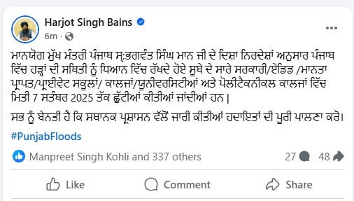 School/College Holidays; ਪੰਜਾਬ ਦੇ ਵਿਚ ਪੈ ਰਹੇ ਲਗਾਤਾਰ ਭਾਰੀ ਮੀਂਹ ਅਤੇ ਹੜ੍ਹਾਂ ਦੇ ਚੱਲਦਿਆਂ ਮੁੱਖ ਮੰਤਰੀ ਭਗਵੰਤ ਸਿੰਘ ਮਾਨ ਦੇ ਦਿਸ਼ਾ ਨਿਰਦੇਸ਼ਾਂ ਅਨੁਸਾਰ ਪੰਜਾਬ ਵਿੱਚ ਹੜ੍ਹਾਂ ਦੀ ਸਥਿਤੀ ਨੂੰ ਧਿਆਨ ਵਿੱਚ ਰੱਖਦੇ ਹੋਏ ਸੂਬੇ ਦੇ ਸਾਰੇ ਸਰਕਾਰੀ/ਏਡਿਡ /ਮਾਨਤਾ ਪ੍ਰਾਪਤ/ਪ੍ਰਾਈਵੇਟ ਸਕੂਲਾਂ/ ਕਾਲਜਾਂ/ਯੂਨੀਵਰਸਿਟੀਆਂ ਅਤੇ ਪੋਲੀਟੈਕਨੀਕਲ ਕਾਲਜਾਂ ਵਿੱਚ ਮਿਤੀ 7 ਸਤੰਬਰ 2025 ਤੱਕ ਛੁੱਟੀਆਂ ਵਧਾ ਦਿੱਤੀਆਂ ਹਨ। ਇਸਤੋਂ ਪਹਿਲਾਂ ਵੀ ਲਗਾਤਾਰ ਦੋ ਵਾਰ ਸਕੂਲਾਂ ਵਿਚ ਛੁੱਟੀਆਂ ਕੀਤੀਆਂ ਗਈਆਂ ਸਨ।