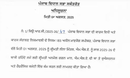 Chandigarh News: anmol gagan mann; ਨਾਮਵਰ ਪੰਜਾਬੀ ਗਾਇਕ ਅਤੇ ਸਾਬਕਾ ਮੰਤਰੀ ਅਨਮੋਲ ਗਗਨ ਮਾਨ, ਜੋਕਿ ਖਰੜ ਵਿਧਾਨ ਸਭਾ ਹਲਕੇ ਤੋਂ ਵਿਧਾਇਕ ਹਨ, ਦੀ ਵਿਧਾਨ ਸਭਾ ਦੀ ਇੱਕ ਮਹੱਤਵਪੂਰਨ ਕਮੇਟੀ ਵਿਚੋਂ ਛੁੱਟੀ ਕਰ ਦਿੱਤੀ ਗਈ ਹੈ। ਉਨ੍ਹਾਂ ਦੀ ਥਾਂ ‘ਤੇ ਰਾਜਪੁਰਾ ਤੋਂ ਆਪ ਦੀ ਮਹਿਲਾ ਵਿਧਾਇਕਾ ਸ਼੍ਰੀਮਤੀ ਨੀਨਾ ਮਿੱਤਲ ਨੂੰ ਸਾਲ 2025-26 ਲਈ ਵਿਧਾਨ ਸਭਾ ਦੀ ਪ੍ਰਸ਼ਨ ਅਤੇ ਸੰਦਰਭ ਕਮੇਟੀ ਦਾ ਮੈਂਬਰ ਨਾਮਜਦ ਕੀਤਾ ਗਿਆ। ਇਹ ਕਾਰਵਾਈ ਸਪੀਕਰ ਵੱਲੋਂ ਪੰਜਾਬ ਵਿਧਾਨ ਸਭਾ ਦੇ ਨਿਯਮ 183 ਤਹਿਤ ਕੀਤੀ ਗਈ ਹੈ।
