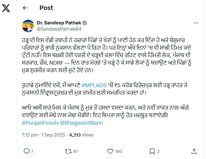 Punjab News: ਪੰਜਾਬ ਦੇ ਵਿਚ ਹੜ੍ਹਾਂ ਦੀ ਭਿਆਨਕ ਤਬਾਹੀ ਦੇ ਚੱਲਦਿਆਂ ਆਮ ਲੋਕਾਂ ਦੇ ਹੋ ਰਹੇ ਵੱਡੀ ਪੱਧਰ’ਤੇ ਨੁਕਸਾਨ ਨੂੰ ਦੇਖਦਿਆਂ ਰਾਜ ਸਭਾ ਮੈਂਬਰ ਡਾ ਸੰਦੀਪ ਪਾਠਕ ਅੱਗੇ ਆਏ ਹਨ।ਉਨ੍ਹਾਂ ਆਪਣੇ #MPLADS ਫੰਡ ‘ਚੋਂ ਫਿਰੋਜ਼ਪੁਰ ਲਈ ਹੜ੍ਹ ਰਾਹਤ ਤੇ ਨੁਕਸਾਨੀ ਇੰਫ੍ਰਾਸਟ੍ਰਕਚਰ ਦੀ ਮੁੜ ਤਾਮੀਰ ਵਾਸਤੇ ₹5 ਕਰੋੜ ਰੁਪਏ ਦੇਣ ਦਾ ਐਲਾਨ ਕੀਤਾ ਹੈ। ਇਸ ਸਬੰਧੀ ਆਪਣੇ ਸੋਸਲ ਮੀਡੀਆ ਖਾਤੇ ਉੱਪਰ ਜਾਣਕਾਰੀ ਦਿੰਦਿਆਂ ਡਾ ਪਾਠਕ ਨੇ ਲਿਖਿਆ ਹੈ ਕਿ ,‘‘ਹੜ੍ਹਾਂ ਦੀ ਇਸ ਵੱਡੀ ਤਬਾਹੀ ਨੇ ਹਜ਼ਾਰਾਂ ਪਿੰਡਾਂ ਤੇ ਖੇਤਾਂ ਨੂੰ ਪਾਣੀ ਹੇਠ ਕਰ ਦਿੱਤਾ ਹੈ ਅਤੇ ਬੇਸ਼ੁਮਾਰ ਪਰਿਵਾਰਾਂ ਨੂੰ ਭਾਰੀ ਨੁਕਸਾਨ ਝੱਲਣਾ ਪੈ ਰਿਹਾ ਹੈ। ਪਰ ਇਨ੍ਹਾਂ ਔਖੇ ਦਿਨਾਂ ‘ਚ ਵੀ ਸਾਡੀ ਹਿੰਮਤ ਕਦੇ ਟੁੱਟੀ ਨਹੀਂ।