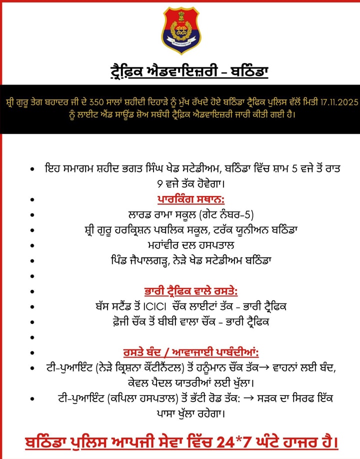 Bathinda News:ਐਸਐਸਪੀ ਮੈਡਮ ਅਮਨੀਤ ਕੌਂਡਲ ਨੇ ਦੱਸਿਆ ਕਿ ਸ਼੍ਰੀ ਗੁਰੂ ਤੇਗ ਬਹਾਦਰ ਜੀ ਦੇ 350 ਸਾਲਾਂ ਸ਼ਹੀਦੀ ਦਿਹਾੜੇ ਦੇ ਮੱਦੇਨਜਰ ਜ਼ਿਲ੍ਹਾ ਪ੍ਰਸ਼ਾਸਨ ਵੱਲੋਂ ਸਥਾਨਕ ਸ਼ਹੀਦ ਭਗਤ ਸਿੰਘ ਬਹੁ ਮੰਤਵੀ ਖੇਡ ਸਟੇਡੀਅਮ ਵਿਖੇ 17 ਨਵੰਬਰ 2025 ਨੂੰ ਕਰਵਾਏ ਜਾ ਰਹੇ ਲਾਈਟ ਐਂਡ ਸਾਊਂਡ ਸ਼ੋਅ ਦੇ ਸੰਬੰਧ ਵਿੱਚ ਜ਼ਿਲ੍ਹਾ ਪੁਲਿਸ ਵੱਲੋਂ ਸਾਰੇ ਰੂਟਾਂ ਨੂੰ ਸੁਚਾਰੂ ਅਤੇ ਸੁਰੱਖਿਅਤ ਬਣਾਉਣ ਲਈ ਟ੍ਰੈਫ਼ਿਕ ਐਡਵਾਈਜ਼ਰੀ ਜਾਰੀ ਕੀਤੀ ਗਈ ਹੈ। ਲਾਈਟ ਐਂਡ ਸਾਊਂਡ ਸ਼ੋਅ ਦਾ ਸਮਾਂ ਸ਼ਾਮ 6 ਤੋਂ 7 ਵਜੇ ਤੱਕ ਰਹੇਗਾ।