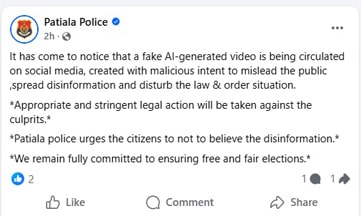 ਦੂਜੇ ਪਾਸੇ ਪਟਿਆਲਾ ਪੁਲਿਸ ਨੇ ਵੀ ਅਪਣੇ ਫ਼ੇਸਬੁੱਕ ਪੇਜ਼ ‘ਤੇ ਇਸ ਆਡੀਓ ਨੂੰ ਝੂਠੀ ਅਤੇ ਗਲਤ ਕਰਾਰ ਦਿੰਦਿਆਂ ਦਾਅਵਾ ਕੀਤਾ ਹੈ ਕਿ ਇਹ AI ਨਾਲ ਤਿਆਰ ਕੀਤੀ ਗਈ ਹੈ ਤਾਂ ਕਿ ਪੁਲਿਸ ਦਾ ਅਕਸ ਖਰਾਬ ਕੀਤਾ ਜਾ ਸਕੇ। ਪੁਲਿਸ ਅਧਿਕਾਰੀਆਂ ਮੁਤਾਬਕ ਅਜਿਹਾ ਕਰਨ ਵਾਲਿਆਂ ਵਿਰੁਧ ਸਖ਼ਤ ਕਾਨੂੰਨੀ ਕਾਰਵਾਈ ਕੀਤੀ ਜਾਵੇਗੀ।ਦਸਣਾ ਬਣਦਾ ਹੈਕਿ ਤਰਨਤਾਰਨ ਉੱਪ ਚੋਣ ਤੋਂ ਬਾਅਦ ਲਗਾਤਾਰ ਅਕਾਲੀ ਦਲ ਤੇ ਸਰਕਾਰ ਵਿਚਕਾਰ ਟਸਲ ਵਧਦੀ ਜਾ ਰਹੀ ਹੈ ਤੇ ਬੀਤੇ ਕੱਲ ਵੀ ਪਟਿਆਲਾ ਦੇ ਘਨੌਰ ਹਲਕੇ ਵਿਚ ਨਾਮਜਦਗੀਆਂ ਦਾਖਲ ਕਰਨ ਨੂੰ ਲੈ ਕੇ ਹੰਗਾਮਾ ਹੋਇਆ ਸੀ।