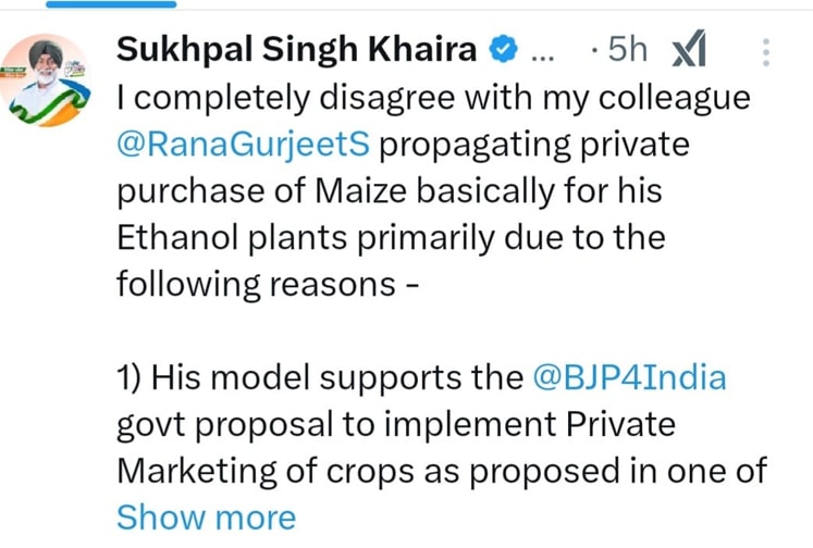 Chandigarh News: ਪਿਛਲੇ ਕੁੱਝ ਦਿਨਾਂ ਤੋਂ ਜਨਤਕ ਤੌਰ ’ਤੇ ਵੱਡੀਆਂ ਸਿਆਸੀ ਇਛਾਵਾਂ ਦਾ ਇਜ਼ਹਾਰ ਕਰ ਰਹੇ ਕਾਂਗਰਸ ਪਾਰਟੀ ਦੇ ਕਪੂਰਥਲਾ ਤੋਂ ਵਿਧਾਇਕ ਰਾਣਾ ਗੁਰਜੀਤ ਸਿੰਘ ’ਤੇ ਪਾਰਟੀ ਦੇ ਹੀ ਸਾਥੀ ਵਿਧਾਇਕ ਸੁਖਪਾਲ ਸਿੰਘ ਖ਼ਹਿਰਾ ਨੇ ਸਵਾਲ ਖੜੇ ਕੀਤੇ ਹਨ। ਰਾਣਾ ਗੁਰਜੀਤ ਸਿੰਘ ਵੱਲੋਂ ਮਾਲਵਾ ਪੱਟੀ ’ਚ ਵੱਡੇ ਪ੍ਰੋਗਰਾਮ ਕਰਕੇ ਕਿਸਾਨਾਂ ਨੂੰ ਮੱਕੀ ਉਪਰ ਨਿੱਜੀ ਤੌਰ ’ਤੇ ਐਮ.ਐਸ.ਪੀ ਦੇਣ ਦਾ ਐਲਾਨ ਕੀਤਾ ਜਾ ਰਿਹਾ। ਆਪਣੇ ਸੋਸਲ ਮੀਡੀਆ ਅਕਾਉਂਟ ’ਤੇ ਇੱਕ ਲੰਮੀ ਚੋੜੀ ਪੋਸਟ ਪਾ ਕੇ ਸੁਖਪਾਲ ਖ਼ਹਿਰਾ ਨੇ ਰਾਣਾ ਗੁਰਜੀਤ ਸਿੰਘ ਦੇ ਵੱਲੋਂ ਕੀਤੇ ਜਾ ਰਹੇ ਇਸ ਪ੍ਰਚਾਰ ਨਾਲ ਪੂਰੀ ਤਰ੍ਹਾਂ ਅਸਹਿਮਤ ਜਤਾਈ ਹੈ। ਉਨ੍ਹਾਂ ਦਾਅਵਾ ਕੀਤਾ ਕਿ ਸਾਥੀ ਵਿਧਾਇਕ ਵੱਲੋਂ ਆਪਣੇ ਈਥਾਨੌਲ ਪਲਾਂਟਾਂ ਲਈ ਮੱਕੀ ਦੀ ਨਿੱਜੀ ਖਰੀਦ ਕੀਤੀ ਜਾ ਰਹੀ ਹੈ। ਖ਼ਹਿਰਾ ਨੇ ਸਵਾਲ ਖੜੇ ਕਰਦਿਆਂ ਦਾਅਵਾ ਕੀਤਾ ਕਿ ਰਾਣਾ ਗੁਰਜੀਤ ਦਾ ਇਹ ਮਾਡਲ ਭਾਜਪਾ ਸਰਕਾਰ ਦੇ 3 ਕਾਲੇ ਕਾਨੂੰਨਾਂ ਵਿੱਚੋਂ ਇੱਕ ਵਿੱਚ ਪ੍ਰਸਤਾਵਿਤ ਫਸਲਾਂ ਦੀ ਨਿੱਜੀ ਮਾਰਕੀਟਿੰਗ ਨੂੰ ਲਾਗੂ ਕਰਨ ਦੇ ਪ੍ਰਸਤਾਵ ਦਾ ਸਮਰਥਨ ਕਰਦਾ ਹੈ ਜਿਸਦਾ ਕਿਸਾਨਾਂ ਵੱਲੋਂ 2021 ਜਬਰਦਸਤ ਵਿਰੋਧ ਕੀਤਾ ਗਿਆ ਸੀ। ਉਨ੍ਹਾਂ ਕਿਹਾ ਕਿ ਇਹ ਬਿਲਕੁਲ ਨਿੱਜੀ ਮੰਡੀਕਰਨ ਦਾ ਭਾਜਪਾ-ਅਡਾਣੀ ਮਾਡਲ ਹੈ।