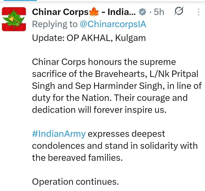 ਜਦਕਿ ਦੂਜਾ ਜਵਾਨ ਹਰਮਿੰਦਰ ਸਿੰਘ (25 ਸਾਲ) ਫ਼ਤਿਹਗੜ੍ਹ ਦਾ ਰਹਿਣ ਵਾਲਾ ਸੀ। ਇਸਤੋਂ ਇਲਾਵਾ ਚਾਰ ਹੋਰ ਫ਼ੌਜੀ ਜਵਾਨਾਂ ਦੇ ਜਖ਼ਮੀ ਹੋਣ ਦੀ ਵੀ ਖ਼ਬਰ ਹੈ, ਜਿੰਨ੍ਹਾਂ ਦਾ ਇਲਾਜ਼ ਚੱਲ ਰਿਹਾ। ਭਾਰਤੀ ਫ਼ੌਜ ਦੀ ਚਿਨਾਰ ਕੋਰ ਨੇ ਆਪਣੇ ਸੋਸਲ ਮੀਡੀਆ ‘ਤੇ ਦੋਨਾਂ ਜਵਾਨਾਂ ਦੀ ਸ਼ਹਾਦਤ ਨੂੰ ਸਲੂਟ ਕਰਦਿਆਂ ਆਪਰੇਸ਼ਨ ਬਾਰੇ ਦਸਿਆ ਹੈ। ਸੂਚਨਾ ਮੁਤਾਬਕ ਮੁਕਾਬਲਾ ਹਾਲੇ ਵੀ ਜਾਰੀ ਹੈ ਤੇ ਕੁੱਝ ਅੱਤਵਾਦੀਆਂ ਦੇ ਵੀ ਮਾਰੇ ਜਾਣ ਦੀ ਖ਼ਬਰ ਹੈ।