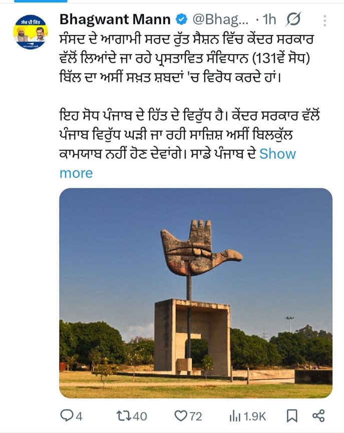 Chandigarh News:ਪੰਜਾਬ ਵਿਰੁੱਧ ਕੇਂਦਰ ਸਰਕਾਰ ਦੇ ਇਕ ਹੋਰ ਘਿਨਾਉਣੇ ਕਦਮ ਦੀ ਜ਼ੋਰਦਾਰ ਮੁਖਾਲਫ਼ਤ ਕਰਦਿਆਂ ਪੰਜਾਬ ਦੇ ਮੁੱਖ ਮੰਤਰੀ ਭਗਵੰਤ ਸਿੰਘ ਮਾਨ ਨੇ ਅੱਜ ਕਿਹਾ ਕਿ ਪੰਜਾਬ ਸਰਕਾਰ ਸੂਬੇ ਕੋਲੋਂ ਉਸ ਦੀ ਰਾਜਧਾਨੀ ਚੰਡੀਗੜ੍ਹ ਨੂੰ ਖੋਹਣ ਲਈ ਭਾਜਪਾ ਦੀ ਅਗਵਾਈ ਵਾਲੀ ਐਨ.ਡੀ.ਏ. ਸਰਕਾਰ ਦੇ ਨਾਪਾਕ ਮਨਸੂਬੇ ਸਫਲ ਨਹੀਂ ਹੋਣ ਦੇਵੇਗੀ।ਅੱਜ ਇੱਥੇ ਇਕ ਬਿਆਨ ਵਿੱਚ ਮੁੱਖ ਮੰਤਰੀ ਨੇ ਕਿਹਾ ਕਿ ਚੰਡੀਗੜ੍ਹ, ਪੰਜਾਬ ਦਾ ਅਨਿੱਖੜਵਾਂ ਅੰਗ ਸੀ, ਹੈ ਅਤੇ ਰਹੇਗਾ। ਉਨ੍ਹਾਂ ਕਿਹਾ ਕਿ ਕੇਂਦਰ ਸਰਕਾਰ ਵੱਲੋਂ ਅਗਾਮੀ ਸੰਸਦੀ ਸੈਸ਼ਨ ਵਿੱਚ ਸੰਵਿਧਾਨ ਦੀ ਧਾਰਾ-240 ਦੇ ਤਹਿਤ ਪੰਜਾਬ ਦੀ ਰਾਜਧਾਨੀ ਨੂੰ ਵੀ ਬਾਕੀ ਕੇਂਦਰੀ ਸ਼ਾਸਿਤ ਪ੍ਰਦੇਸ਼ਾਂ ਨਾਲ ਜੋੜਣ ਲਈ ਸੋਧ ਕਰਨ ਦੇ ਲਿਆਂਦੇ ਜਾ ਰਹੇ ਪ੍ਰਸਤਾਵ ਦੀ ਹਰਗਿਜ਼ ਇਜਾਜ਼ਤ ਨਹੀਂ ਦਿੱਤੀ ਜਾਵੇਗੀ। ਉਨ੍ਹਾਂ ਕਿਹਾ ਕਿ ਭਾਵੇਂ ਹਰੇਕ ਸੂਬੇ ਦਾ ਆਪਣੀ ਰਾਜਧਾਨੀ ਉਤੇ ਪੂਰਾ ਹੱਕ ਹੁੰਦਾ ਹੈ ਪਰ ਪੰਜਾਬ ਨੂੰ ਉਸ ਦੀ ਰਾਜਧਾਨੀ ਸੌਂਪਣ ਤੋਂ ਆਨਾਕਾਨੀ ਕਰਕੇ ਸੂਬੇ ਨਾਲ ਵੱਡੀ ਬੇਇਨਸਾਫੀ ਕੀਤੀ ਜਾ ਰਹੀ ਹੈ। ਭਗਵੰਤ ਸਿੰਘ ਮਾਨ ਨੇ ਕਿਹਾ ਕਿ ਇਹ ਸੱਚ ਹੈ ਕਿ ਭਾਜਪਾ ਦੀ ਅਗਵਾਈ ਵਾਲੀ ਕੇਂਦਰ ਸਰਕਾਰ ਸ਼ਰੇਆਮ ਧੱਕੇਸ਼ਾਹੀ ਉਤੇ ਉੱਤਰੀ ਹੋਈ ਹੈ।